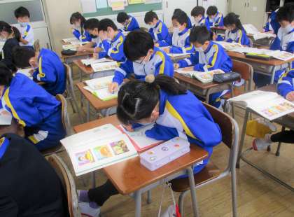 国語科の学習では、「ようすをあらわすことば」についての学習をしています。今日は、いくつかの絵について、ようすをあらわすことばを使って文をつくりました。みんな集中してつくっていました。