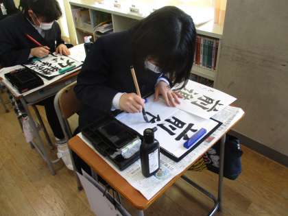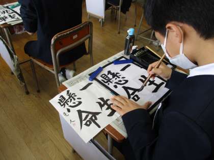 自分の大切にしたい言葉を書にします。どの子も真剣な表情で練習中です。教室が静まりかえり、一画一画に思いをこめている様子が伝わってきました。字の特徴を捉え丁寧に書くことができました。