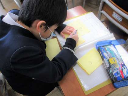 生活科の学習では、調べてきたことをカードにまとめました。小さい頃と今の自分を比べながら、一生懸命に書いていました。