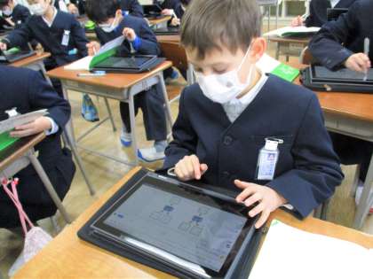 国語科では、漢字と漢字を合体させて、1つの漢字にする学習をしました。カンジーはかせが発明した機械を使い、自分たちでも問題づくりに取り組みました。