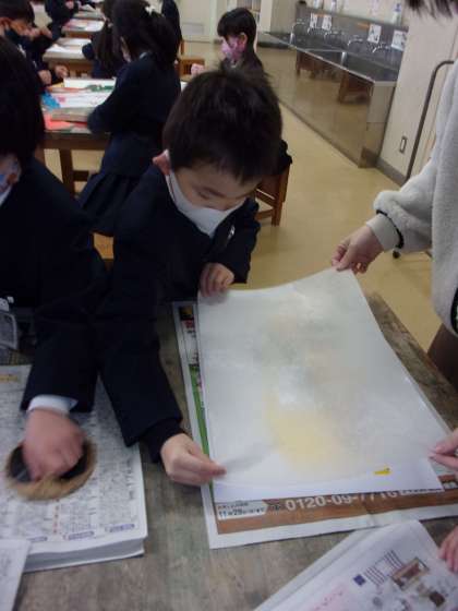 おそるおそる紙をはがすと・・・・とても素敵な作品が写しだされ、笑顔がこぼれる1年生でした。