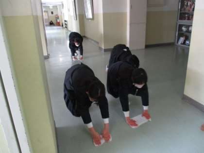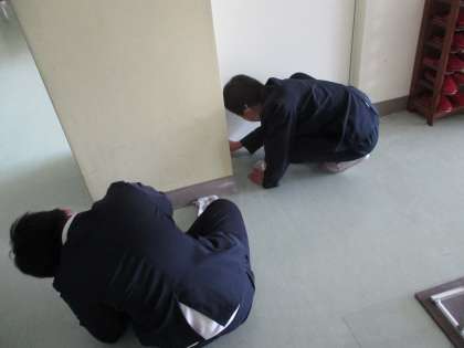今日は、1階の廊下や、正面玄関の汚れとりをしました。長い廊下の雑巾がけは大変でしたが、きれいにしようとがんばっていました。メラミンスポンジを使って、黙々と掃除をする姿もすてきでした。