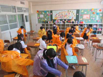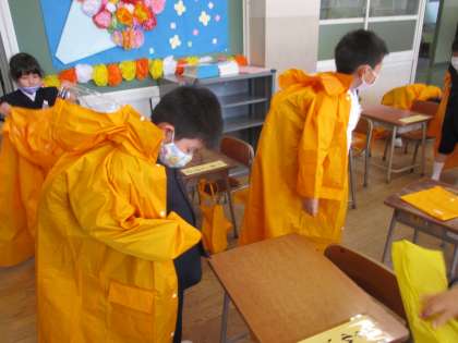 かっぱを着たりたたんだりする練習をしました。先生の話をしっかりと聞いてから着ると、上手にできました。