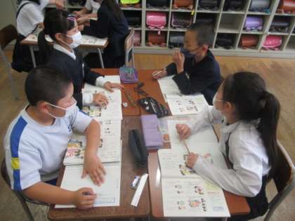 二人ペアや四人グループになり、自分と友達の共通点を見つけました。