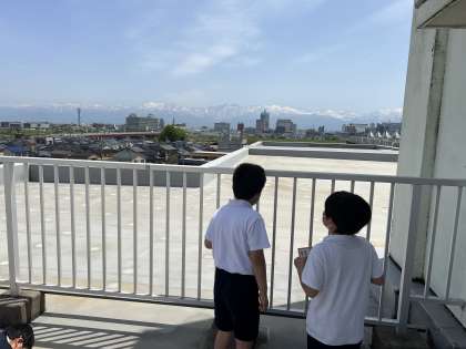 社会科の学習では、屋上から学校のまわりに何があるのか、東西南北を意識しながら調べました。