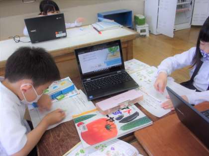 生活科ではやさいづくりに挑戦していきます。今日は、自分の気になっている野菜について本や教科書で調べました。友達と本を貸し合いながら、一生懸命に取り組んでいました。