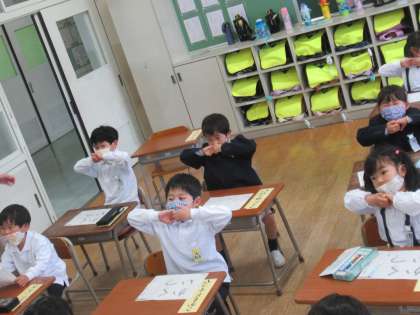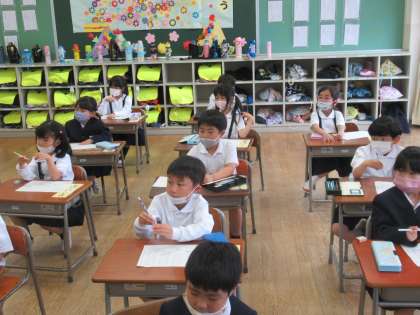書写では、教科書にある「書写体操」をしたり、鉛筆の持ち方の動画を見たりして、正しい姿勢や鉛筆の持ち方を確かめながら学習をしています。