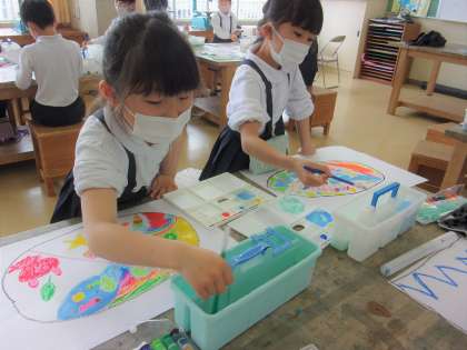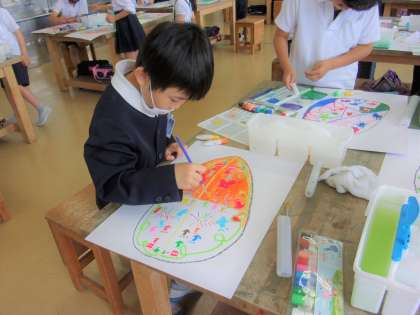 図画工作科の学習の様子です。模様を描いたたまごに水彩で色をつけました。クレパスで描いた模様が消えないように、丁寧に色づけをしていました。「久しぶりに絵の具を使うのが楽しかった」と、満足した様子でした。