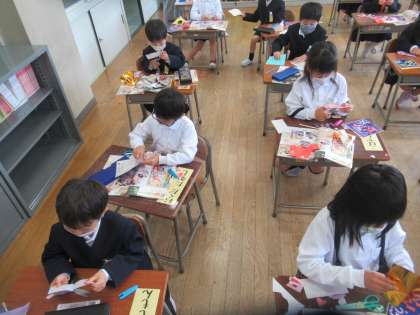 図画工作では「ちょきちょきかざり」をしました。折り紙を折ったり重ねたりして切ると、いろいろな形ができます。できた形のおもしろさを感じながら、作品を仕上げました。