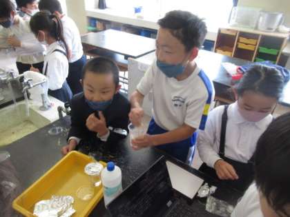 桜っ子タイムには、科学係が企画した「スライム作り」の続きをしました。