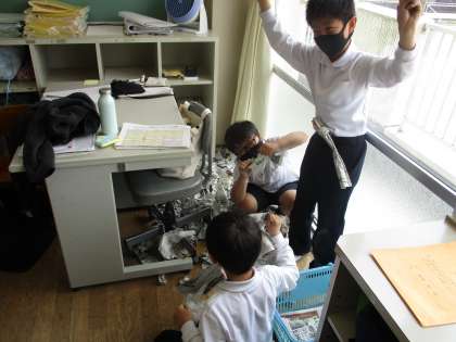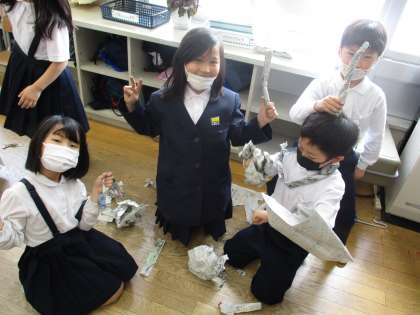 図画工作科の時間の様子です。新聞紙を丸める、破る、ひねるなどのいろいろな技を使いながら、表現していました。次はもっと広いところでやってみたいですね。