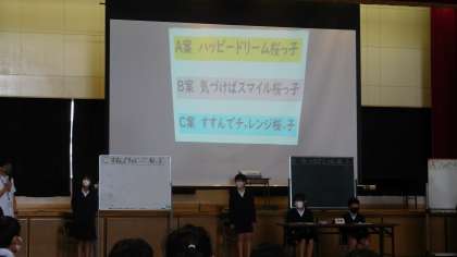 今日の2限目に児童総会を行い、今年度のスローガンについて全校で話し合いました。まず、6年生から3つの案について提案理由が述べられ、その後、学級で話し合ったことやそれぞれの児童の考えを発表しました。どの学年の児童も理由を明確にしながら、自分の考えを堂々と発言している姿が立派でした。また、初めて参加する1年生も進んで発言し、全校で自分たちの桜谷小学校をよくしていきたいという思いが感じられる1時間になりました。