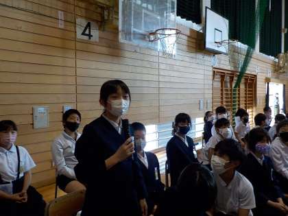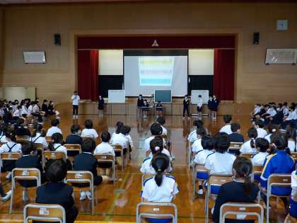 今日は、児童総会を行いました。6年生から提案された3つの案について、全校の子供たちから意見が出されました。5年生は、先日、教室でも意見交換を行ってきました。5年生は積極的に手を挙げていた子も多かったのですが、なかなか当ててもらえず、ちょっとふてくされ気味の子もいました。最終的に多数決を採り、「進んでチャレンジ 桜っ子」が、今年度の児童会の目当てと決まりました。