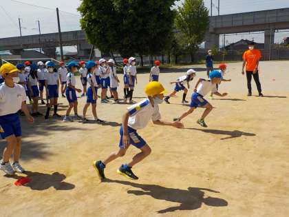 今日は、外部講師の西村先生をお招きして、走り方教室を行いました。体ほぐしに、全身を使ったじゃんけんをしたり、2人でおにごっこをしたりしました。速く走るためには、足だけでなく、体全体、頭も使うと聞き、子供たちは、驚きながらも練習に取り組んでいました。その後、「ピッチ」と「ストライド」を高める練習方法を教えていただき、自分に合うピッチやストライドを探したり、さらに上を目指そうとチャレンジする姿も見られました。