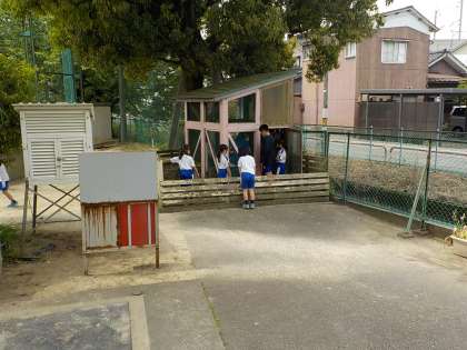 いきいきタイムのことです。KさんとOさんが、ウサギ小屋でマーブルのお世話をしていたところに、1年生が、やってきました。二人は、お世話しながらも1年生に優しく接し、1年生はウサギと楽しそうにふれあっていました。ほほえましい一場面でした。