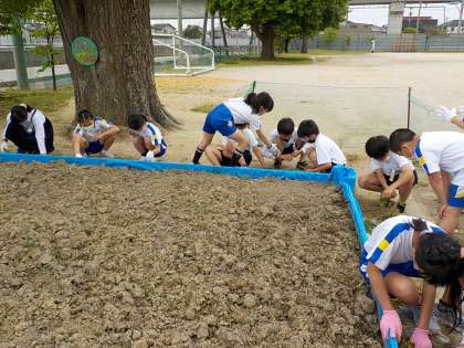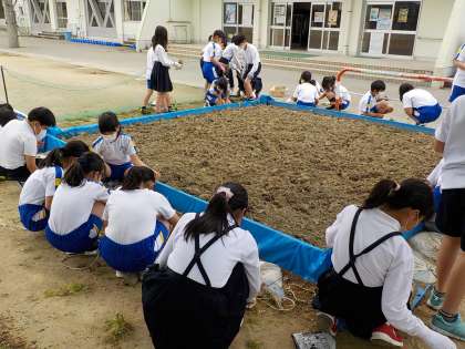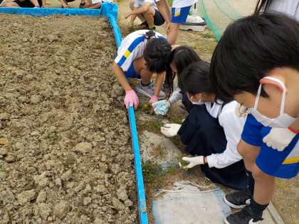 来週から、いよいよ本格的に米づくりの体験が始まります。それを前に、学校の玄関前にある田の周りの草むしりをしました。