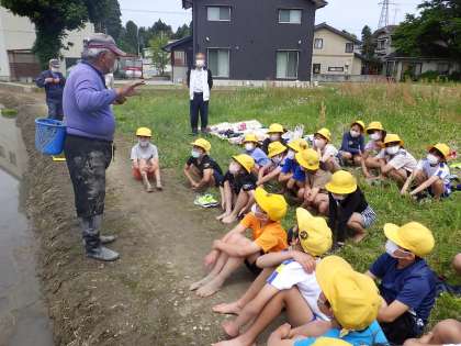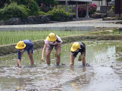 いよいよ、田植えです。西井さんのお話を聞いたあと、田に入りました。地域の方から苗の株をもらい、4本ずつ、植えていきます。初めのうちはおっかなびっくりで、ころがしで付けた目印が見えなかったり、バランスをくずしそうになったりと、なかなか苦戦していましたが、慣れてくるにつれて、手際もよくなってきました。何人か、運悪く、しりもちをついた子もいましたが、ちゃんと着替えを準備していたので、大丈夫でした。保護者のみなさまには、お手数をおかけいたしますが、名誉の汚れだと思って、許してあげて下さい。