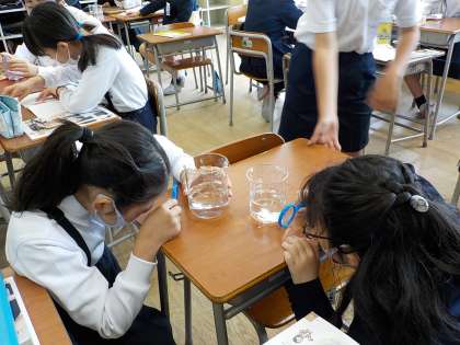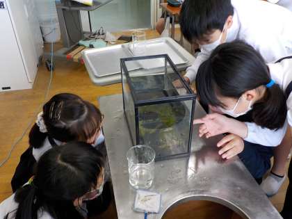 理科の時間に、サンショウウオに続いてやってきた「メダカ」を観察しました。事前に教科書やインターネットで、メダカのオス、メスの見分け方について学習しました。それを生かして、実際のメダカはオスか、メスか、グループで対話しながら判別しました。ビーカーに入れたメダカは、横から見るとレンズ効果があり、大きく見えます。さらに虫めがねを使うことでより大きく拡大して、観察しました。すでに卵を持っているメダカもいました。