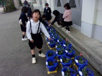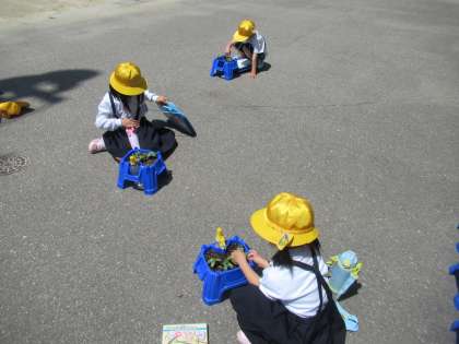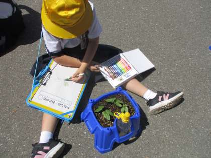 あさがおの芽を観察しました。色や形をよく見てプリントに絵を描きました。「ちょうちょうみたいな形をしているね」「ハートが2つ並んでいるみたいだよ」と、葉の形をいろいろな物に例えていました。これからあさがおがどのように大きくなっていくか、楽しみにしている子供たちです。