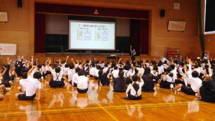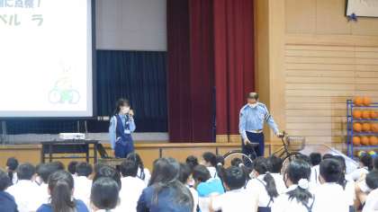 富山西警察署の方からは、自転車の点検の仕方や正しい自転車の乗り方、ルールについて説明していただきました。たくさん教えていただいた中でも、自転車を点検するポイントとして、ブレーキ・タイヤ・ハンドル・車体・ベル・ライトの頭文字をとった「ブタハシャべルラ」という合言葉が印象に残ったようです。また、自転車事故の被害者だけでなく、加害者にもなりうる可能性があること、そして、そういう場合は、その場から立ち去らずに保護者の方や警察の方に連絡し、誠実に対応することの大切さを学びました。