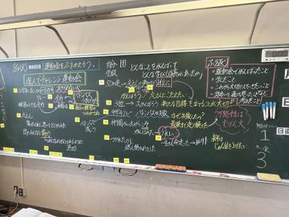 先週の運動会やそれまでの取組を振り返り、学んだことや成長したこと等について話し合いました。負けて悔しい、勝ってうれしいだけではなく、次につながる新たな目標をもつことが大切だという意見が出てきました。また、仲間がいたからがんばることができたということに気付き、今後の活動への意欲を高めていました。