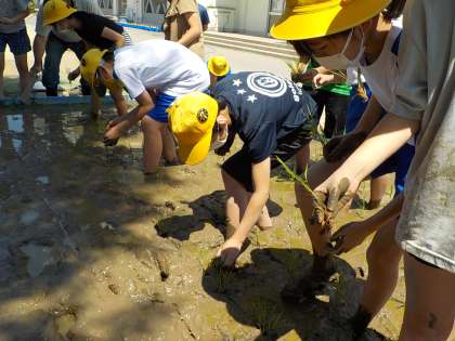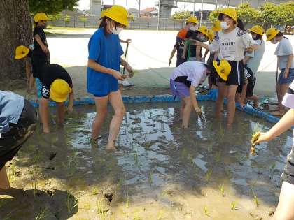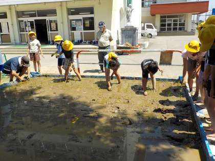 いよいよ苗植えです。先日行った田植えで学んだことを生かして、ていねいに植えることが出来ました。しりもちをついたり、転んだりする子もいませんでした。早く大きくなってほしいですね。