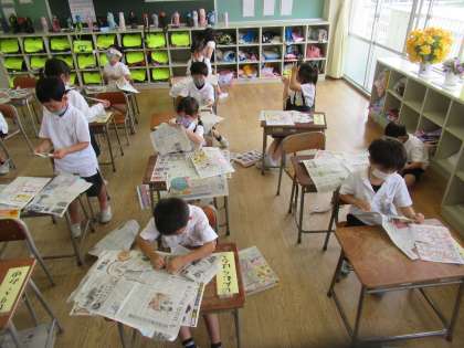新聞やチラシ、包装紙など、いろいろな紙をやぶきました。まっすぐやぐねぐね、かくかくなどいろいろなやぶきかたをしました。子供たちは、とても楽しそうに紙をやぶっていました。