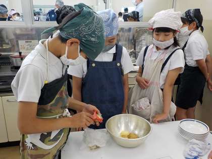 前の時間に、役割分担をしてあったので、手際よく、協力して実習できる予定でしたが、そこはまだまだ子供です。「じゃがいもの皮をむく」一つとっても、家でやっているのが一目で分かる子供と、したことがない子供では、大きな差があります。男子の中にも手際のよい子供がいて、周りの子も驚いていました。