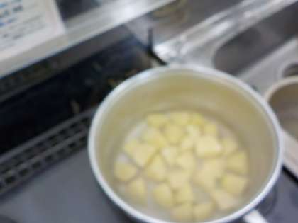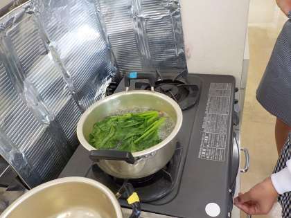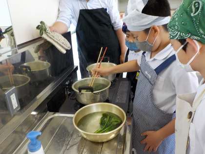 じゃがいもの皮をむき、同じような大きさに切ったあとはゆでる工程ですが、ここでもグループによって差が出ました。鍋になみなみと水を入れたグループは当然、沸騰するまでにかなりの時間を要します。効率よく湯を沸かし、ほうれん草とジャガイモをゆでたグループが食べ終わる頃、ようやく盛りつけをするグループもありました。この失敗は、きっと次にいきることでしょう。
