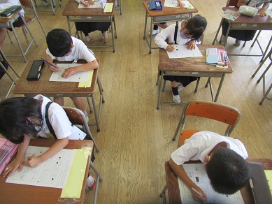 書写では「むすび」の形の練習をしました。横長と縦長の2つの形があることを学習し、丁寧にプリントに練習しました。