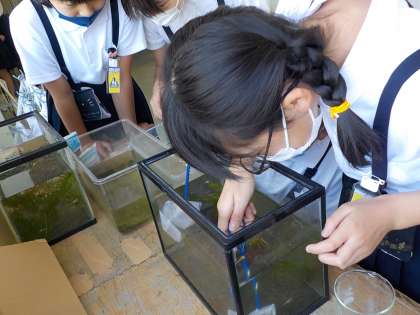 メダカ、サンショウウオ、田んぼの様子について、生活班でローテーションでお世話をしています。水を替えたりえさをやったり、田んぼの担当者は、水の張り具合や温度を見ながら、お世話をしています。