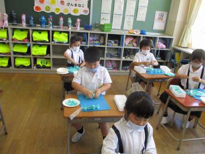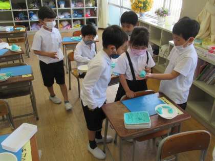 図工で「ごちそうパーティをはじめよう」の学習をしました。子供たちは、粘土で好きなごちそうをたくさんつくりました。出来た作品はお皿にのせて、見せ合いもしました。友達の作品の素敵なところをたくさん見付けていました。