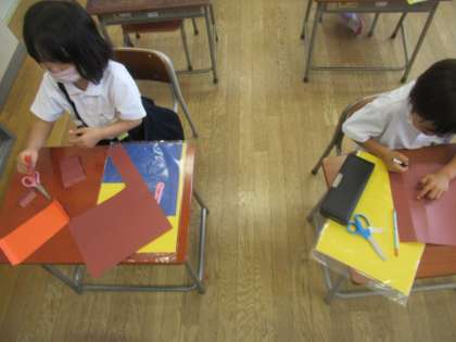 図画工作科で「おってたてたら」の2回目をしました。「家やビルをつくって町みたいにしたい」「公園をつくりたい」など、自分のつくりたい物をイメージしながら、紙がしっかり立つように考えてつくりました。