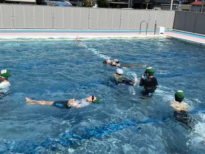 先日の着衣泳に関する講義で学んだ「浮いて待て」を体験しました。