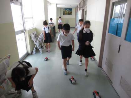 これまでの学習を生かし、自動車の走る速度や走る向きを調整する姿が見られました。