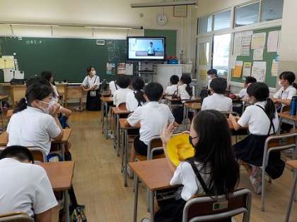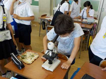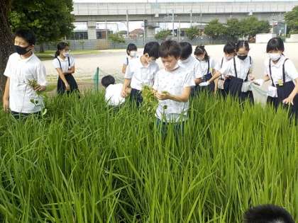 今日は、雨も上がり、学校田の草取りと田んぼの生き物を調べる学習をしました。生き物がいそうな藻や水草を採集し、顕微鏡で微生物を観察しました。プールでは水中鬼ごっこを行い、午後からはお楽しみ会兼お別れ会を行いました。
