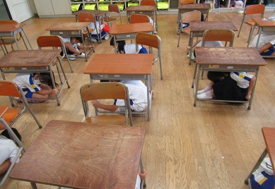 今日は防災の日です。学校では、地震が起こった時の行動を確かめる「シェイクアウト訓練」をしました。「まず低く 頭を守り 動かない」を合い言葉に、真剣に取り組みました。