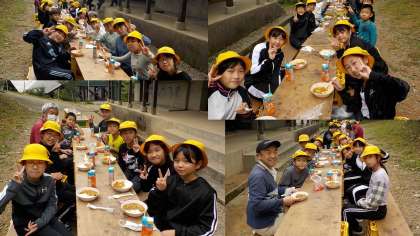 宿泊学習2日目、野外炊飯では、班のみんなで力を合わせて、カレーライスを作りました。