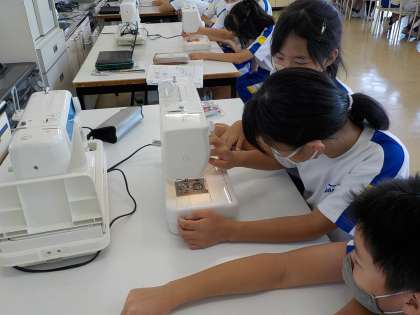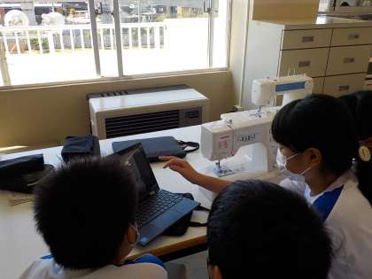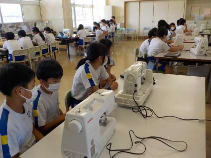 5年生は、家庭科でミシンの使い方を学びます。今日は、実際のミシンを見ながら、部分の名前や、糸の通り道などについて学習しました。ミシンを使ってエプロンを作成する予定です。