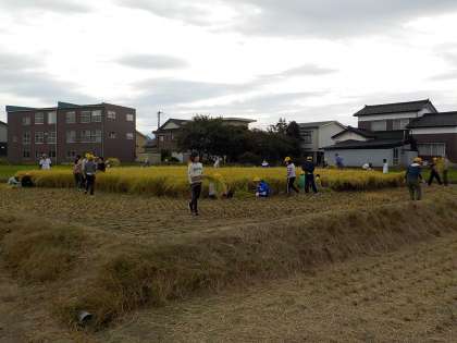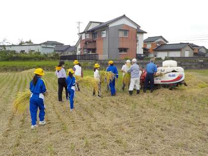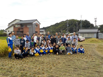 5月に田植えを体験させていただいた田で、稲刈りをさせていただきました。先週行う予定でしたが、天候不順で今日に延期されたのですが、暑くもなく、気持ちよく稲刈りをすることができました。地域の方々の協力もあり、5年生は、みんな一生懸命刈り取り、トラクターに運んでいました。