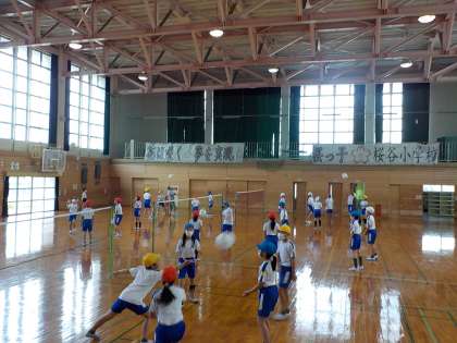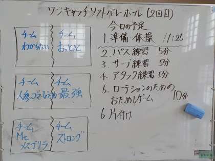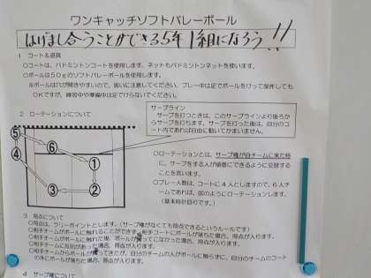 5年生は、体育の時間、「はげまし合うことのできる5年1組になろう」をめあてに、ワンキャッチソフトバレーボールに取り組んでいます。今日は、パス、サーブ、スパイクの練習をした後、ゲームの進め方について、「ローテーション」の方法を確認し、お試しで、ゲームをしてみました。
