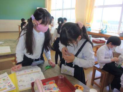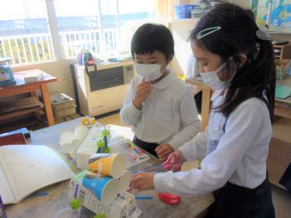 生活科では、うごくおもちゃの学習をしています。友達と知恵を出し合い、協力しながら作る姿が印象的でした。