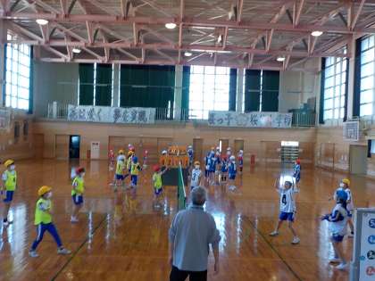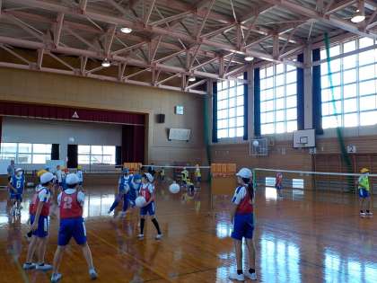 体育の時間、ワンキャッチソフトバレーボールは、いよいよゲームが始まりました。6チーム総当たりで試合をしています。チームメイトに声をかけながら、球技が苦手な子供も楽しそうに取り組んでいます。