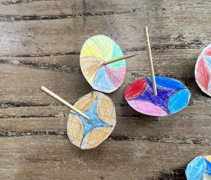 算数科では、コンパスを使って作図をする学習を生かして、自分だけのオリジナルごまを作りました。