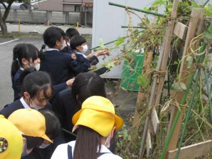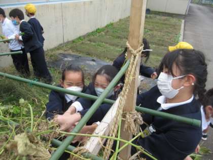 5時間目の始めに、ヘチマの実をとったり、ツルを取り除いたりしました。