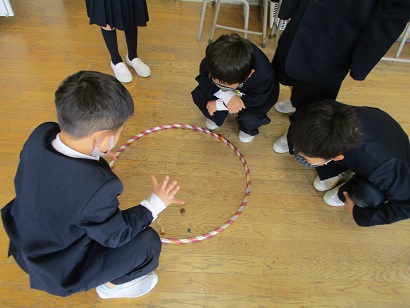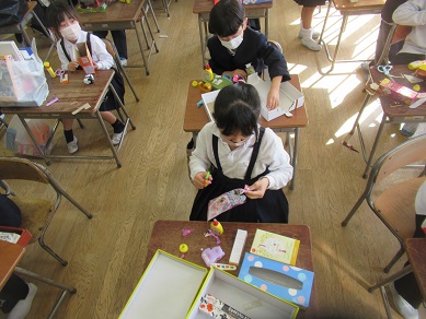 1組は、図画工作科「はこでつくったよ」を始めました。空き箱を切ったりつなげたりしています。2組は、生活科で作った秋のおもちゃで遊びました。友達のおもちゃで遊んで、とても楽しそうでした。