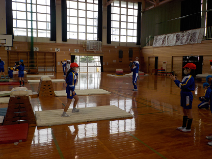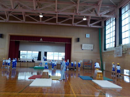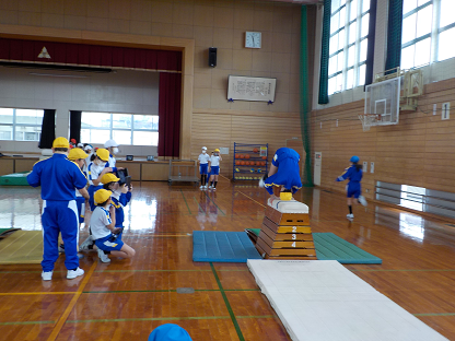 今日は、グループに分かれて、それぞれの跳び箱での演技を動画に記録しました。それを共有することにより、自分の演技を見直したり、友達の演技のよさをみつけ、自分の演技に生かしたりします。