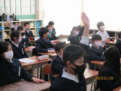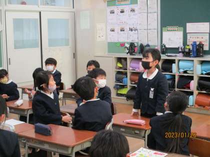 友達の発表を聞いて、「どんな虫を飼っていますか。」「サッカーは週に何回練習していますか。」などと興味津々で質問をしたり、「英語を話せてすごいですね。」「練習をがんばってできるようになったのですね。」などと、友達の良さをたくさん見つけたりしました。