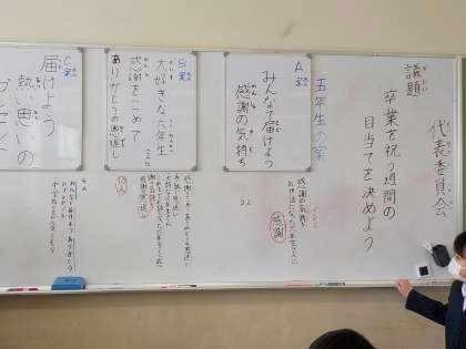 今日は、卒業を祝う週間に向けて、目当てについて話し合う代表委員会を開催しました。進め方や、会場準備などを5年生全員で分担して行いました。下級生の意見を取りまとめ、多数決の結果「大好きな六年生さんに 感謝をこめて 恩返し」に決まりました。