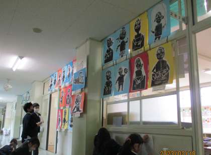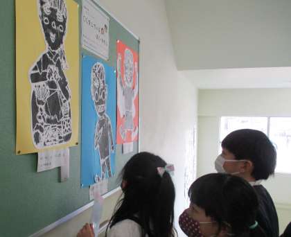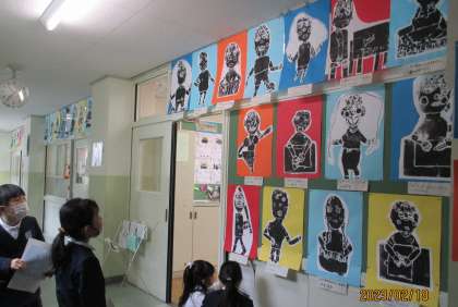 完成した紙版画が廊下に掲示され、よく足を止めて作品に見入っている子どもたち。